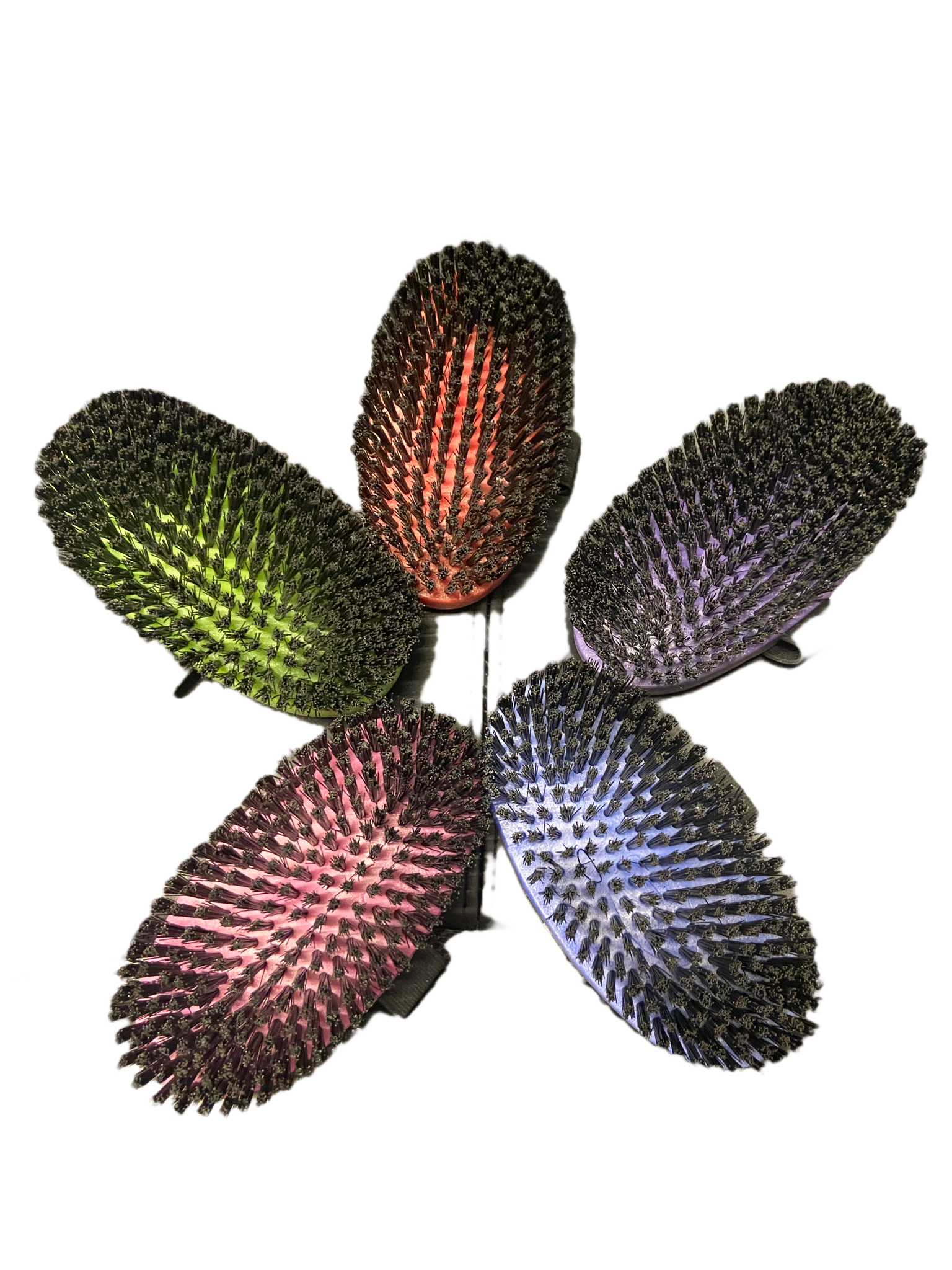 A small, versatile brush made of synthetic bristles, tough enough to remove dried mud, soft enough to be used on a pony’s body.