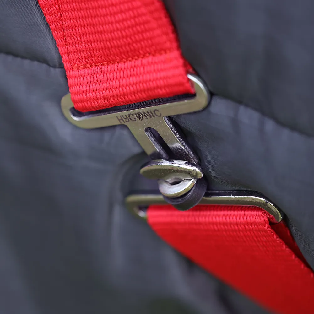 A smart lighter weight stable rug with 100g fill, perfect for when a lighter rug is needed or to use as a layer. Made from a 300 denier material with quilted detailing to keep your horse snug. Featuring red cross surcingle’s, twin clip chest fastenings and fillet string to keep the rug securely in place. With generous tail flap for extra protection and finished with HyCONIC badge logo.