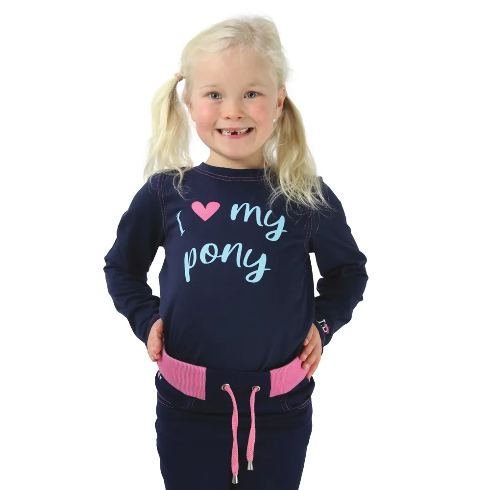 This long sleeve t-shirt is made from 100% cotton, making it both breathable and comfortable. The ‘I Love My Pony’ emblem adorns the front and star and heart elbow patches make this perfect to match to the rest of the collection! This stylish navy top is finished with pink stitching and Little Rider logo to the sleeve.