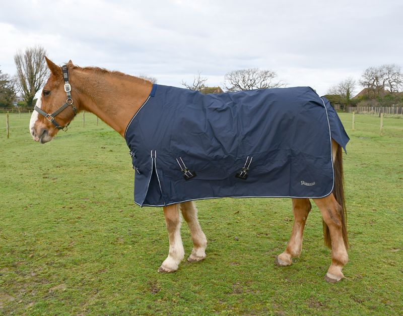 Navy Waterproof outdoor rug with 150gsm polyfill.Double chest straps, cross over surcingles, leg straps, tailguard. 600denier ripstop outer